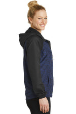 Sport-Tek Ladies Heather Colorblock Raglan Hooded Wind Jacket LST40 True Royal Heather/ Black